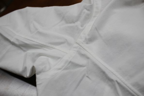 既製品のほとんどのシャツは脇から袖までミシンでダーッと直線で縫うのです。