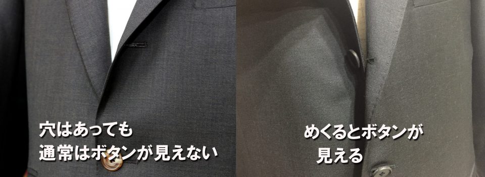 写真のように、見た目は2つボタンスーツのようですが、ボタンが隠してあるので、実際は3つボタンスーツです。ボタンの留め方によって、変わるスーツです。