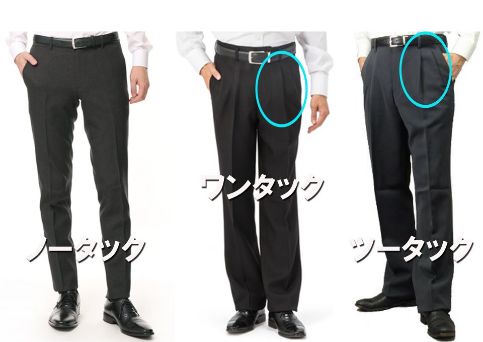 その中でも、「タック」があるか、ないかでも、見た目も、履き心地も違ってきます。