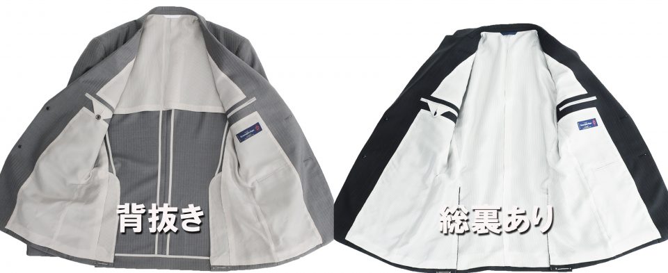 夏、春に多いのが「背抜き」で、裏地がないだけで、かなり涼しく、軽い着心地です。秋冬は「総裏あり」が一般的です。
