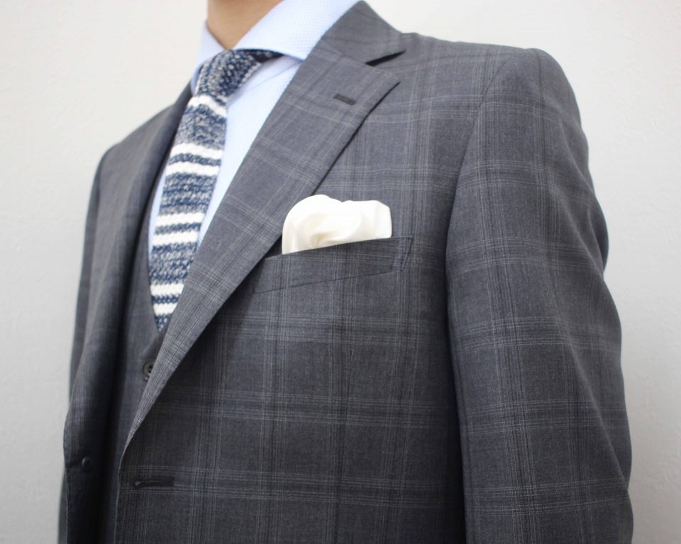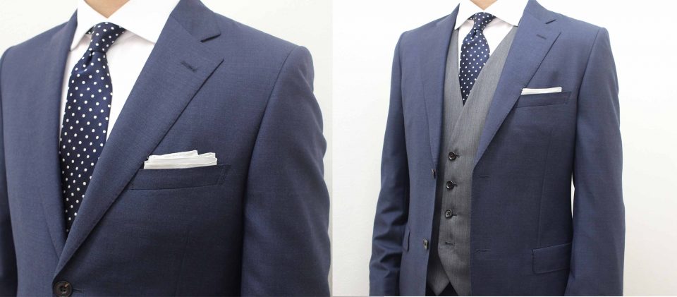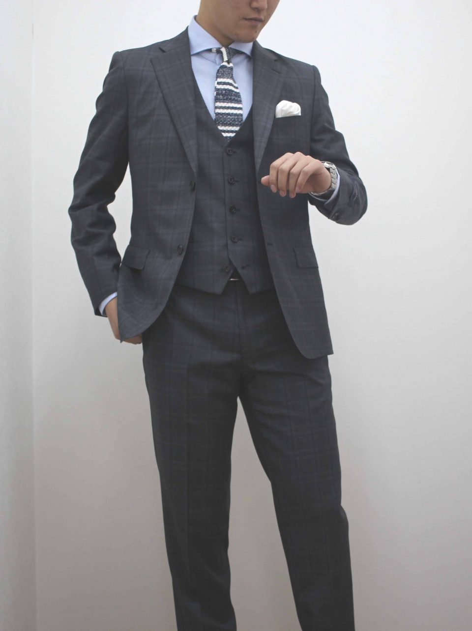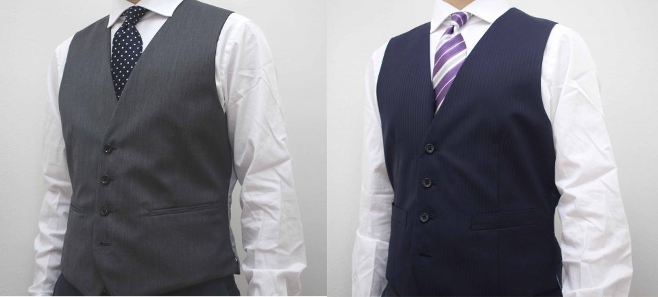 ジレの色は、グレーや、ネイビーカラーのジレであれば、ブラック、ネイビー、グレーとどの色のスーツにも合わせやすいので、お勧めです。