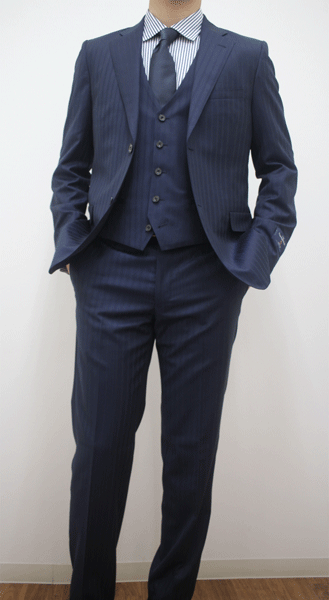 モデル着用の「エルメネジルド・ゼニアのネイビーのスリーピース」通販注文はコチラ