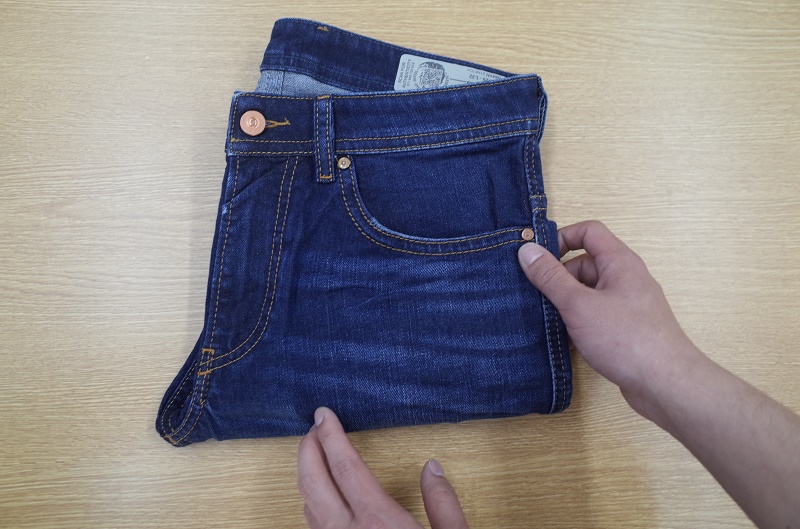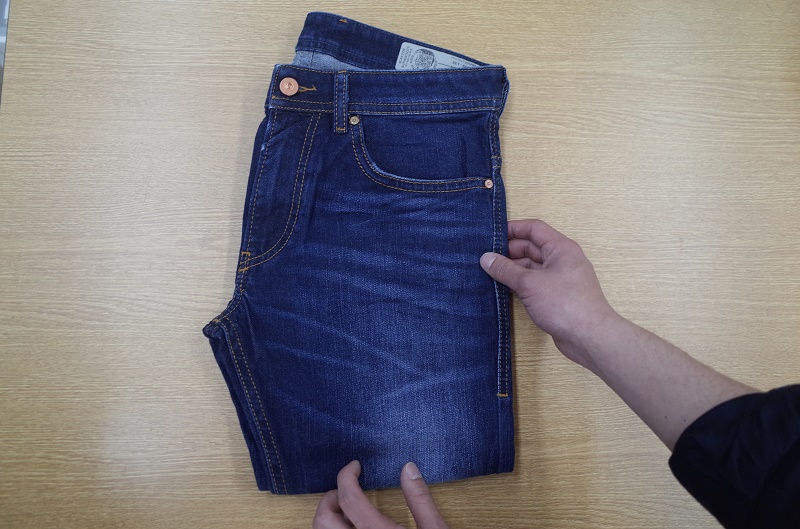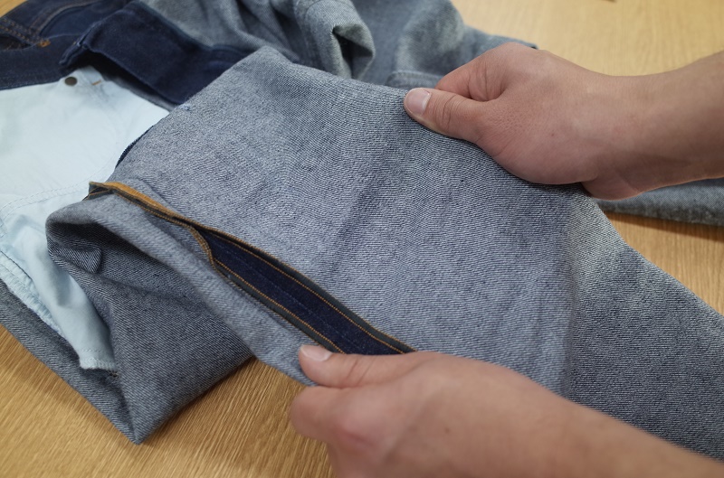 デニムを畳んで収納する場合は、写真のように3つ折もしくは四つ折で収納します。