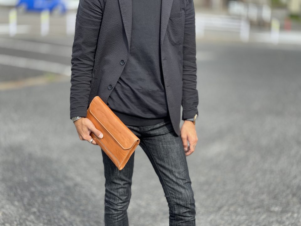 ワントーンのコーディネートはそのままにナチュラルカラーのレザーを使ったクラッチバッグを追加しました。