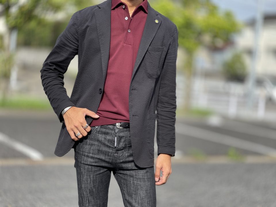 トップス以外のアイテムは一切変えずにインナーをブラックのニットTシャツからボルドーのポロシャツへと変更しただけです。