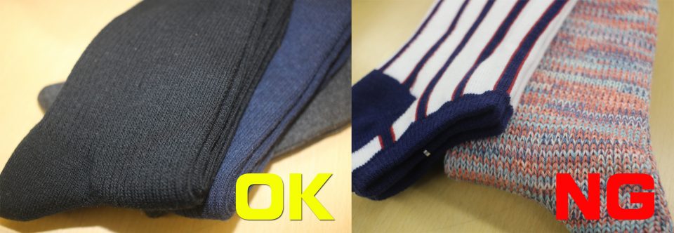 シューズに合わせて、靴下も黒が一般的ですが、スーツに合わせて、ネイビーや、チャコールグレーなど濃い目の控えめな色なら問題ありません。あまり、派手な柄や、短い靴下は、肌が見えたり、スーツよりも、靴下が目立ってしまい、場違いな印象にまりますので、気を付けましょう。