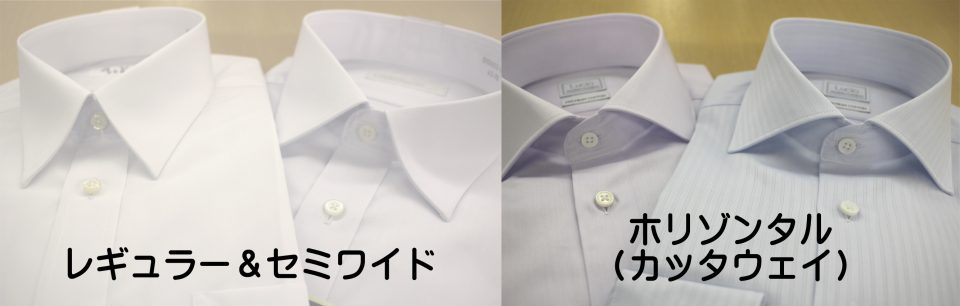 襟のデザインは、レギュラーか、セミワイドが定番です。最近のトレンドは、レギュラーよりも、大きく開いたセミワイドや、ホリゾンタル(カッタウェイ)と言う、後ろに反り返った襟です。