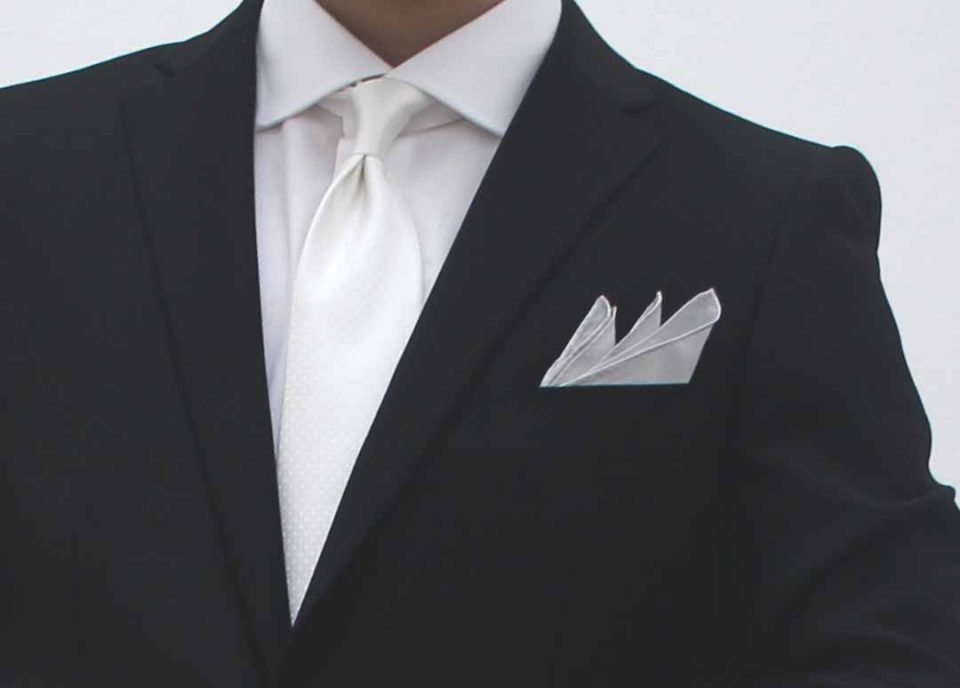 格式高い結婚式で、シャツもネクタイも白系で統一した場合は、ポケットチーフも白で統一するのが無難です。もし、シャツが白であれば、チーフの色も白で合わせるのが一番簡単です。