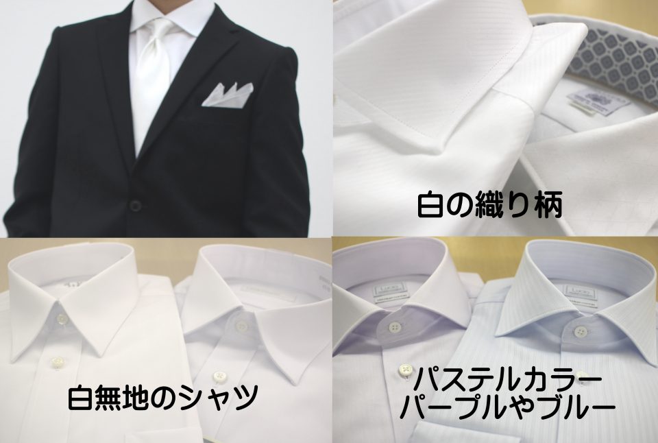 シャツの色は、基本、白が一般的です。特に、親族や、親戚など近い関係での参加の場合は白が、一番定番の色です。ブラックやネイビー、グレーなどダークカラーのスーツとコントラストもはっきりして、相性が良いです。一枚持っていれば安心です。