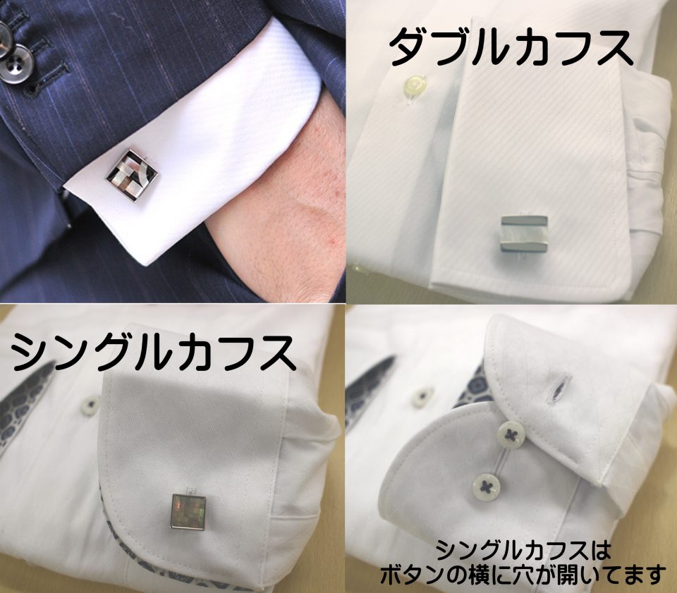 ちなみに、カフスを付けるなら、ドレスシャツもカフスの付けられるシャツを選びましょう。一般的なのは、ダブルカフスと、シングルカフスもシャツです。ダブルカフスではなくても、シングルカフスと言って、カフスがつけられるシャツも多くあります。ビニール袋の中にシャツが入っていると袖口が隠れて見えない場合もあるのですが、袖のボタンとボタンの間に穴が開いているシャツになります。通常、多くの紳士服を扱う店で販売していますが、見分けることが難しい場合は、一度お店のスタッフさんに、袖口のデザインを訪ねてみてくださいね♪
