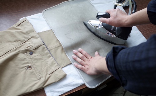 アイロンをかてる際は当て布をし、生地の厚い腰周り部分から行います。その後脚の部分にアイロンをかけましょう。また、ベルトループなどの細かな部分はアイロンの先を使用すると細部までかけることができます。