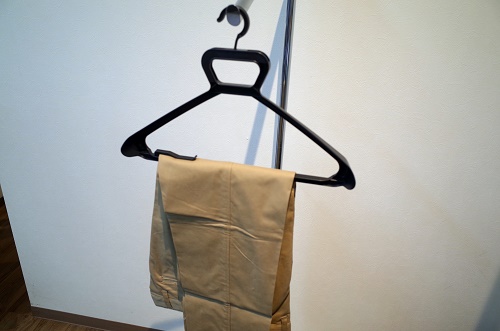 しかし、収納スペースを最小限にして且つシワが付きにくい保管方法としてハンガーに2つ折りで保管する事をオススメします。こうする事で畳みジワが付かず、パンツを半分に折っているので収納スペーズを減らす事も出来ます。