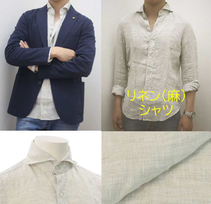 特に、夏にオススメな素材はリネンと呼ばれる麻素材です。麻素材は、リゾート感漂う感じになり、ジャケットに合わせて着こなしても、涼し気な雰囲気になります。