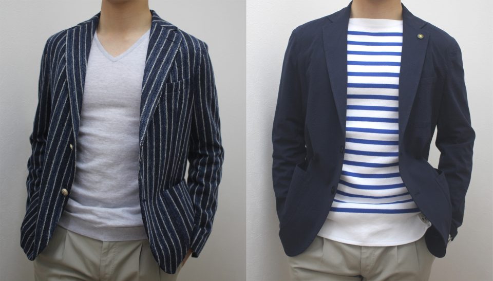 基本的には、合わせるニットは無地で落ち着いた雰囲気がいいですが、ジャケットが無地ならば、ボーダーなど柄でも爽やかに着こなせます。