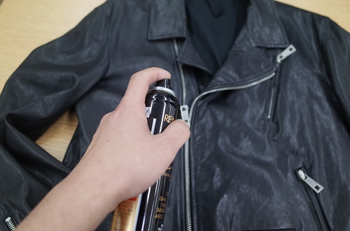 次に防水スプレーをレザーブルゾン全体にムラ無く吹きかけます。また、吹きかける際はスプレーとレザーアウターは30cmほど離しましょう。