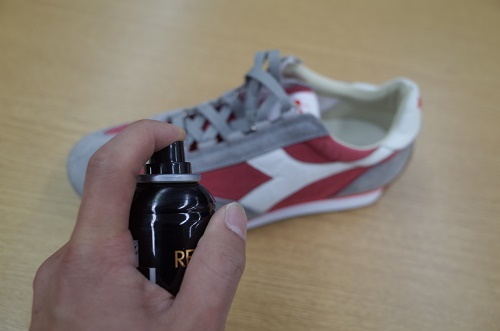 次は、スプレーで栄養を与えます。スウェード用に栄養分、補色、防水をしてくれるスプレーがありますのでそちらを使用します。全体に3回程度まんべんなく振りかけます。また、シューズとスプレーは20㎝から30㎝ほど離して下さい。距離が近すぎると色が濃く付着してしまう場合があるので注意下さい。