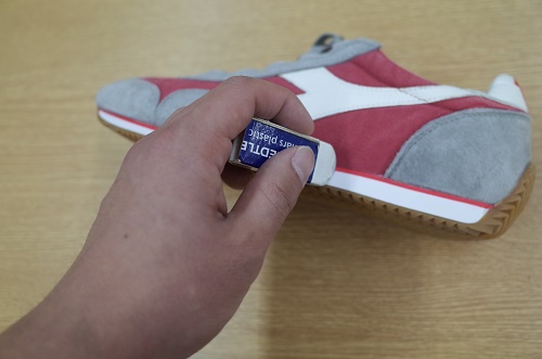 以外に知らない人も多い方法で、ソールのラバー部分などのちょっとした汚れなら消しゴムで擦ると簡単に汚れを落とす事ができます。時間もかからないので履き終わった際に簡単にメンテナンスすることが出来ます。