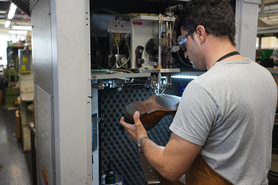 簡単に説明すると、アッパー(甲革)に対して、インソール、中の詰め物、アウトソールを特殊な底縫い機を使って一気に縫う製法です!