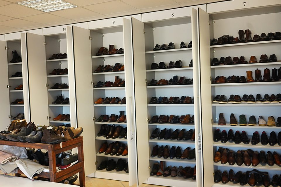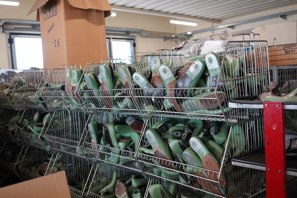 コチラの写真はファクトリーの事務所となっている一室。ご覧の通り一面靴箱だらけ!( ゚Д゚)