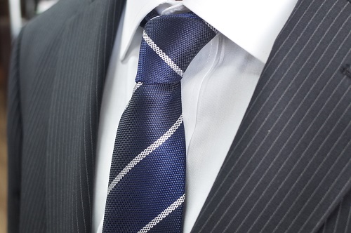 入社式という事もあったのでシャツはテッパンの白無地、また、ビジネス色が強いレジメンタル柄は入社式にはピッタリの1本ですね^^