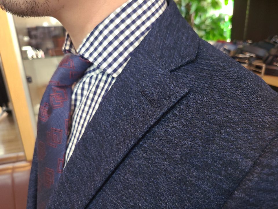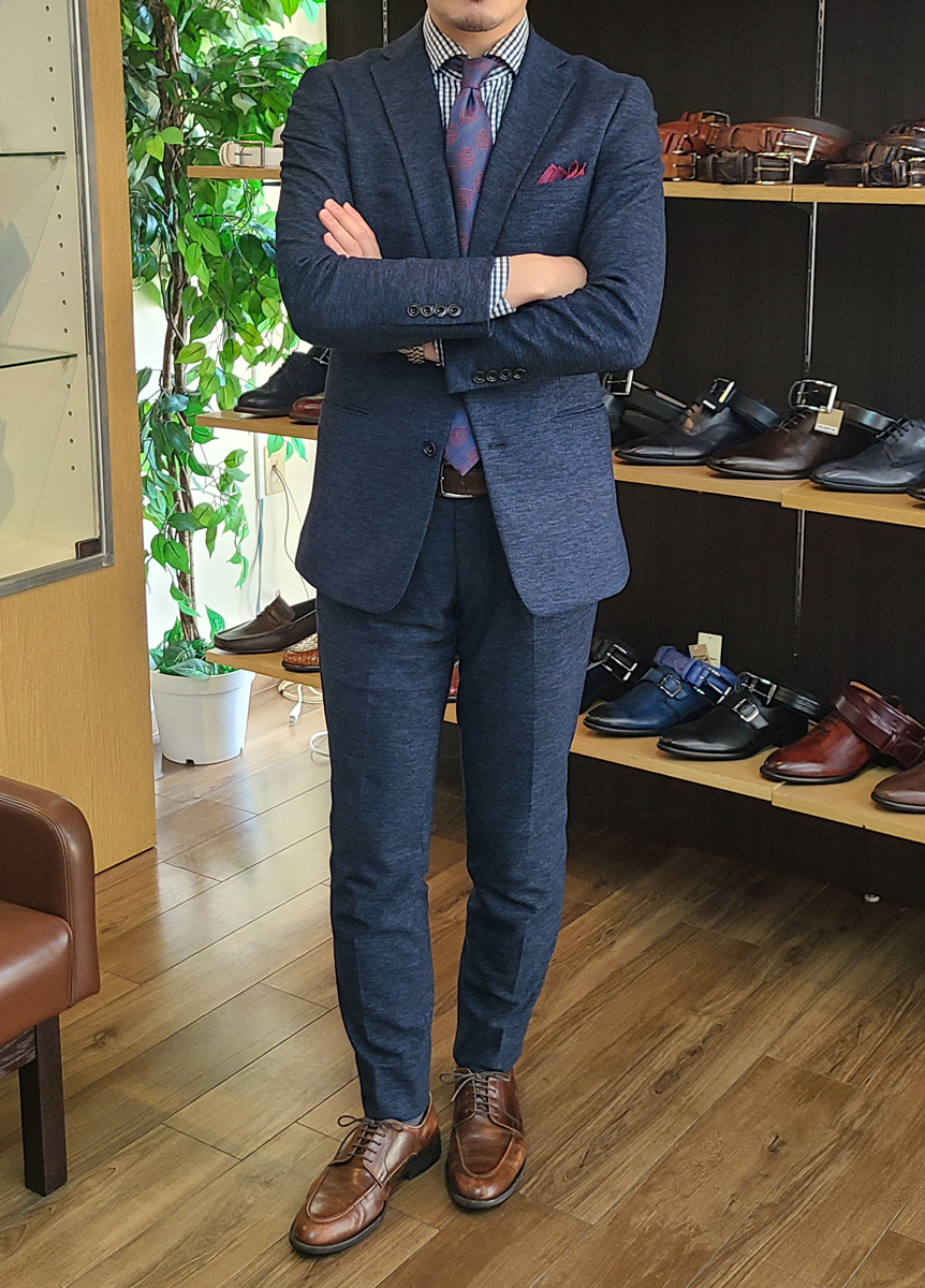 普通のスーツと違った生地感で回りのスーツ姿と無理なく差がつきますね。