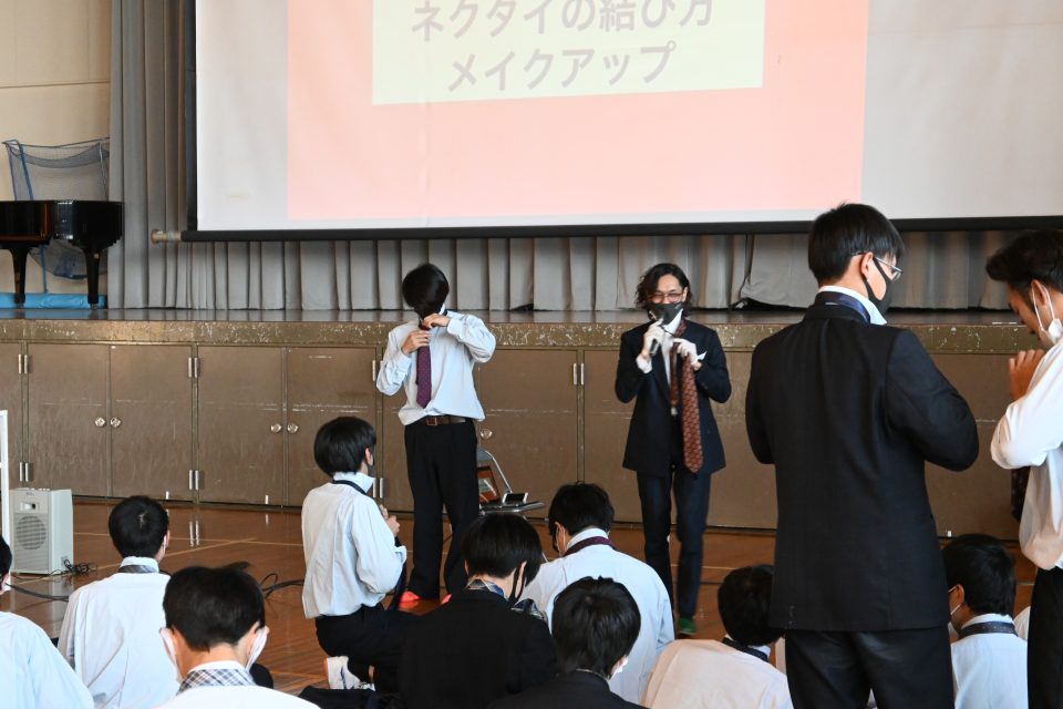 その後は男子、女子にそれぞれ分かれて男子はネクタイの結び方を、レクチャーして実際にネクタイを締めてみました!