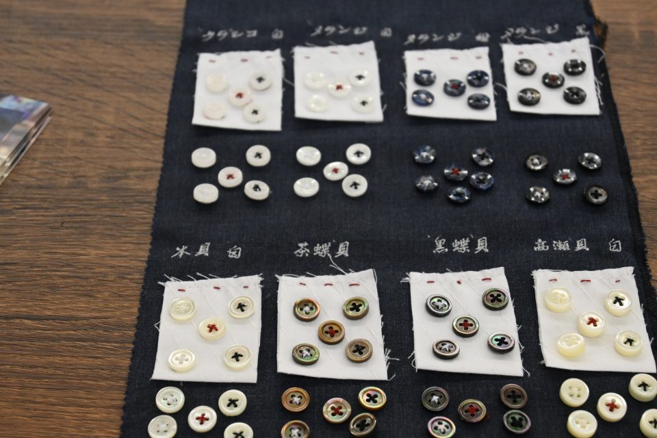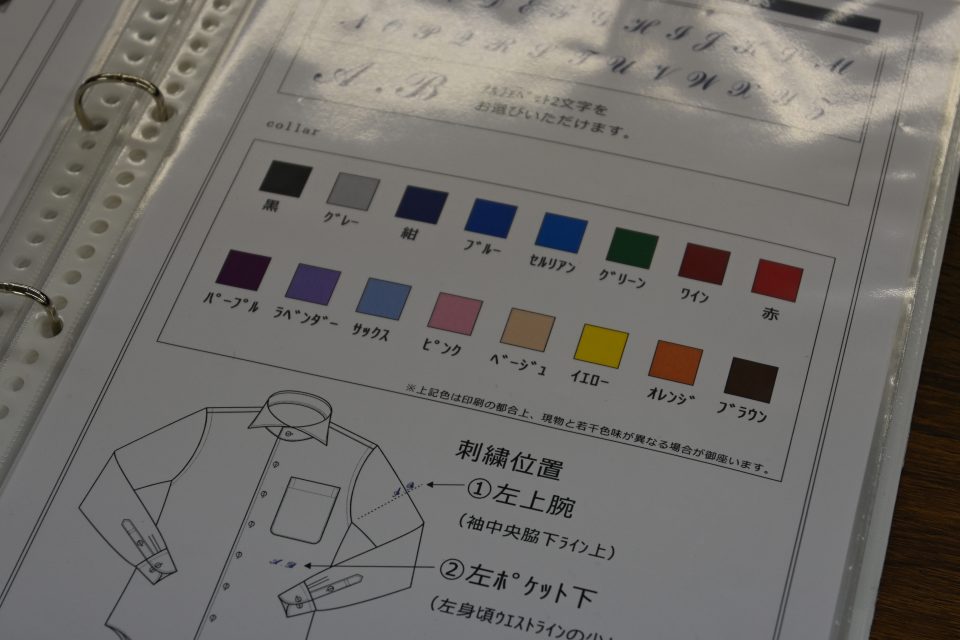 写真のように、サンプルから衿型、ボタン、さらにはネームやイニシャル等も入れられます!