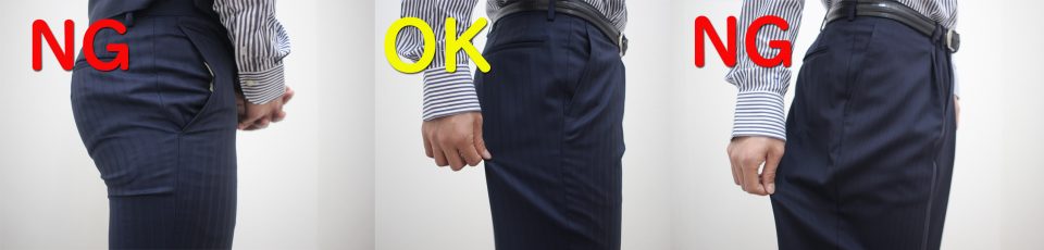 一番左は、ポケットにシワが寄って、パツパツになってしまっています。逆に一番右側は明らかに大きすぎますね!