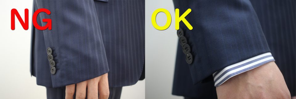 ジャケットの袖丈はシャツが1㎝から1.5㎝ぐらい出ているのが正解です。👍