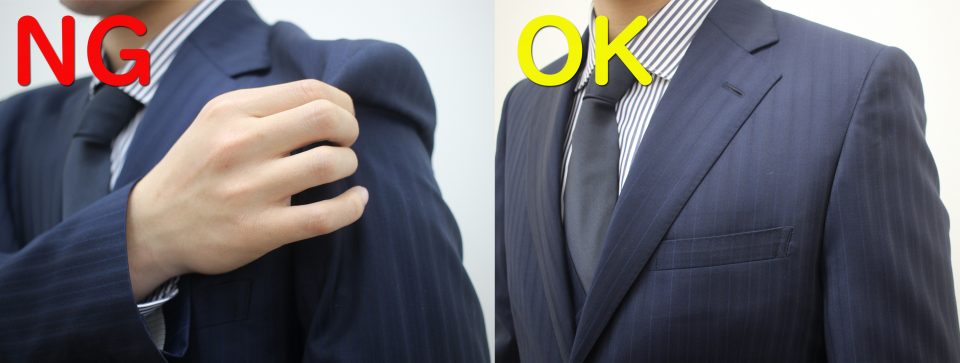 例えば、肩幅は、1㎝ぐらい、つまめるくらいで丁度いいとされてます!それ以上つまめる場合はやや肩幅大きい可能性があります!この辺りは1センチぐらいを目安にして、しっかりとしたお店でスタッフさんに聞くのが一番ですね!👍