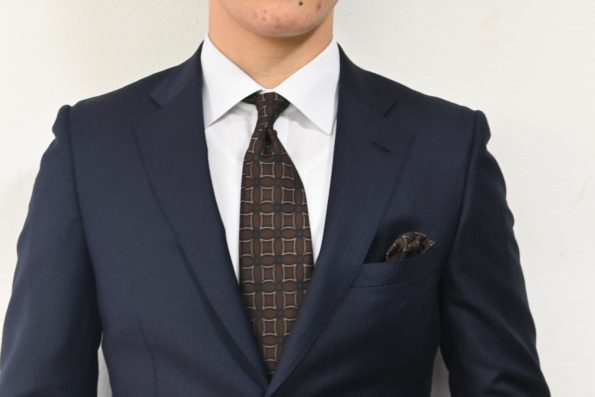 例えば写真のように、ダークネイビーのスーツにはネイビーと相性の良いブラウンのネクタイをチョイス!👍柄も写真のようなプリント柄だと、クラシカルで適度にあか抜けた雰囲気もあり、非常に春らしいVゾーンを演出できます!