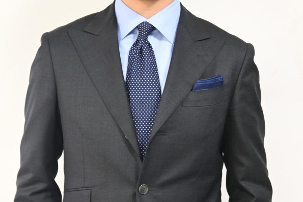 チャコールグレーの光沢の美しいスーツに対して、グレースーツと非常に相性の良いサックスブルーのシャツを合わせ、ネクタイはシンプルながらも仕立ての良い、ネイビーのピンドットのネクタイで合わせる!👍