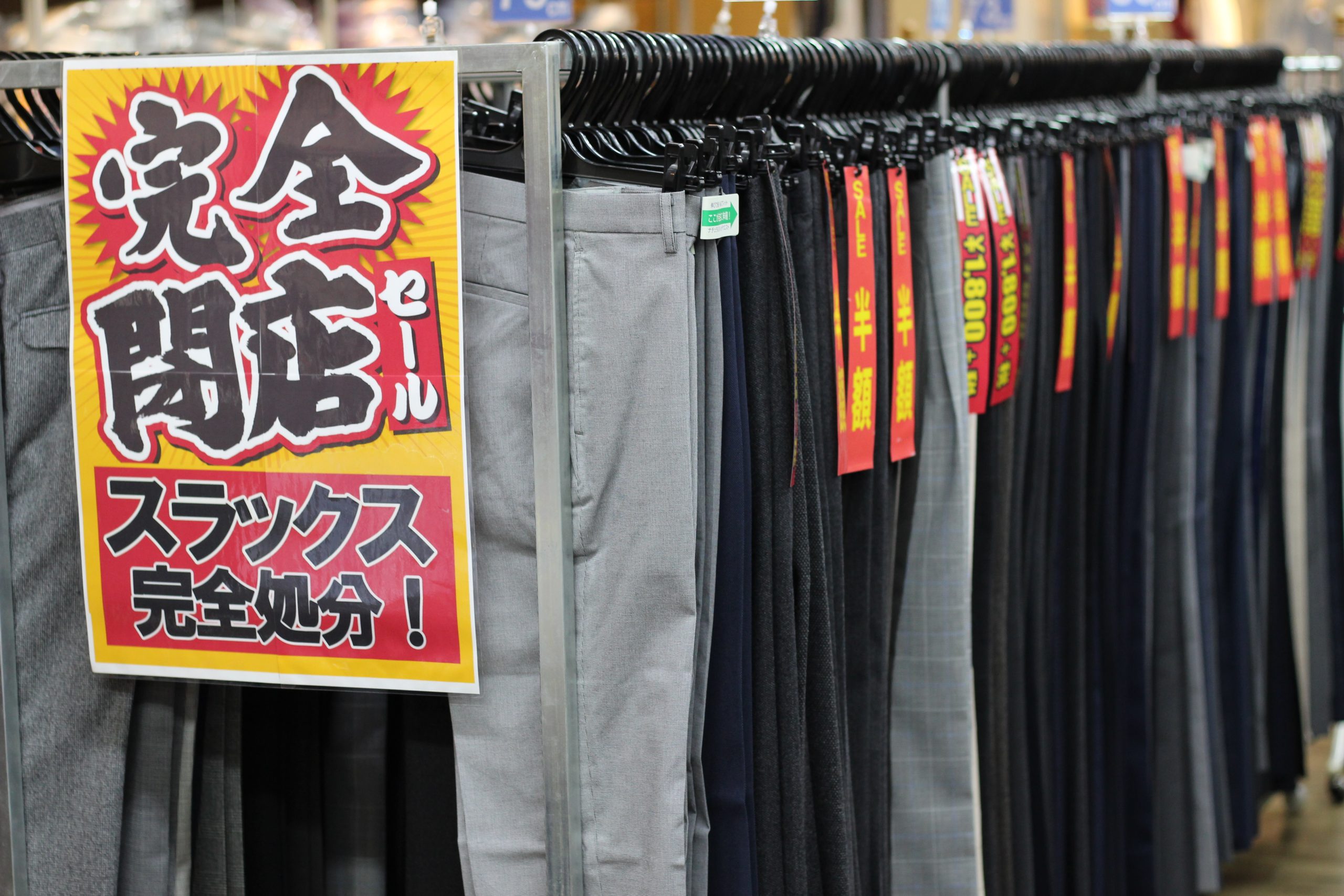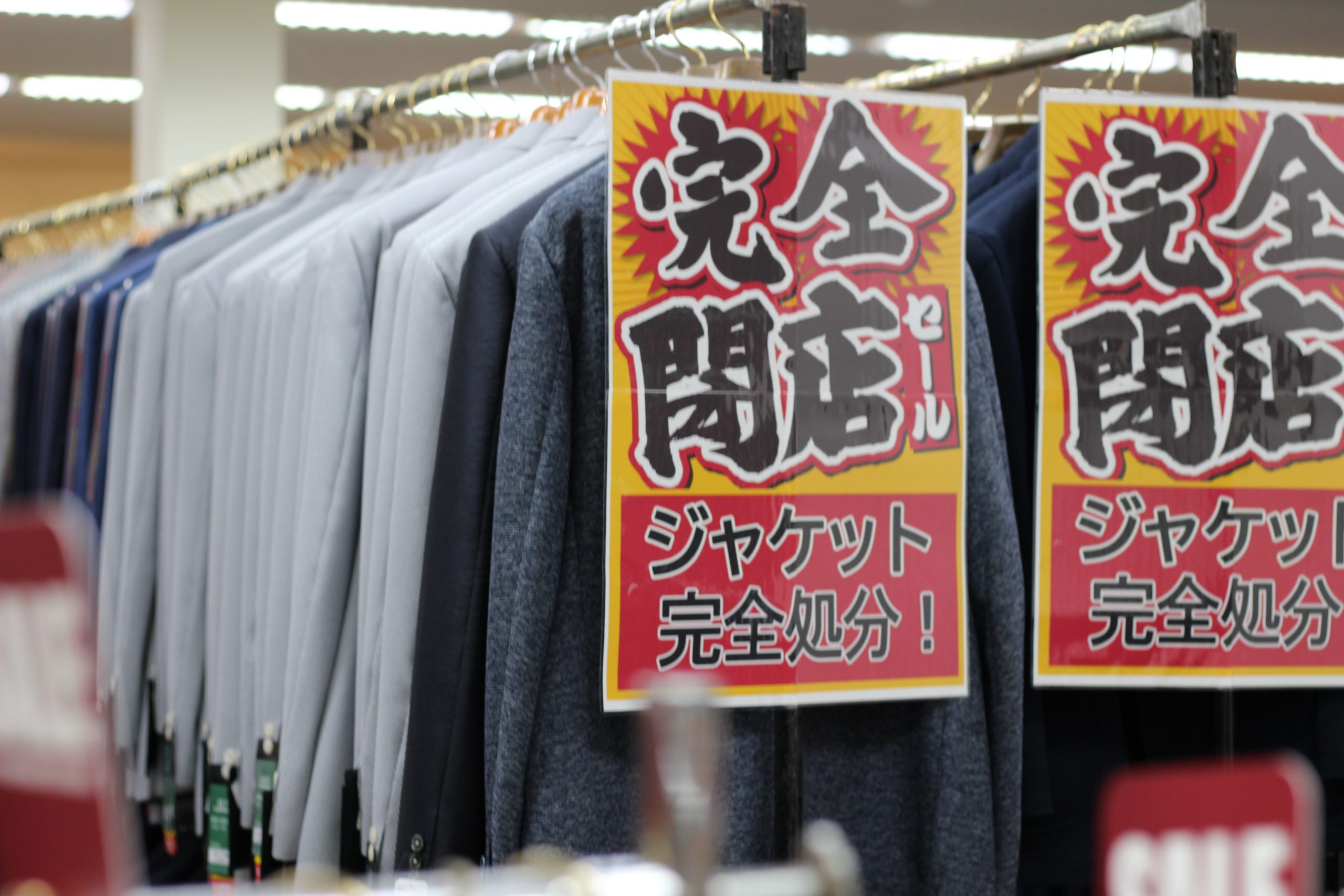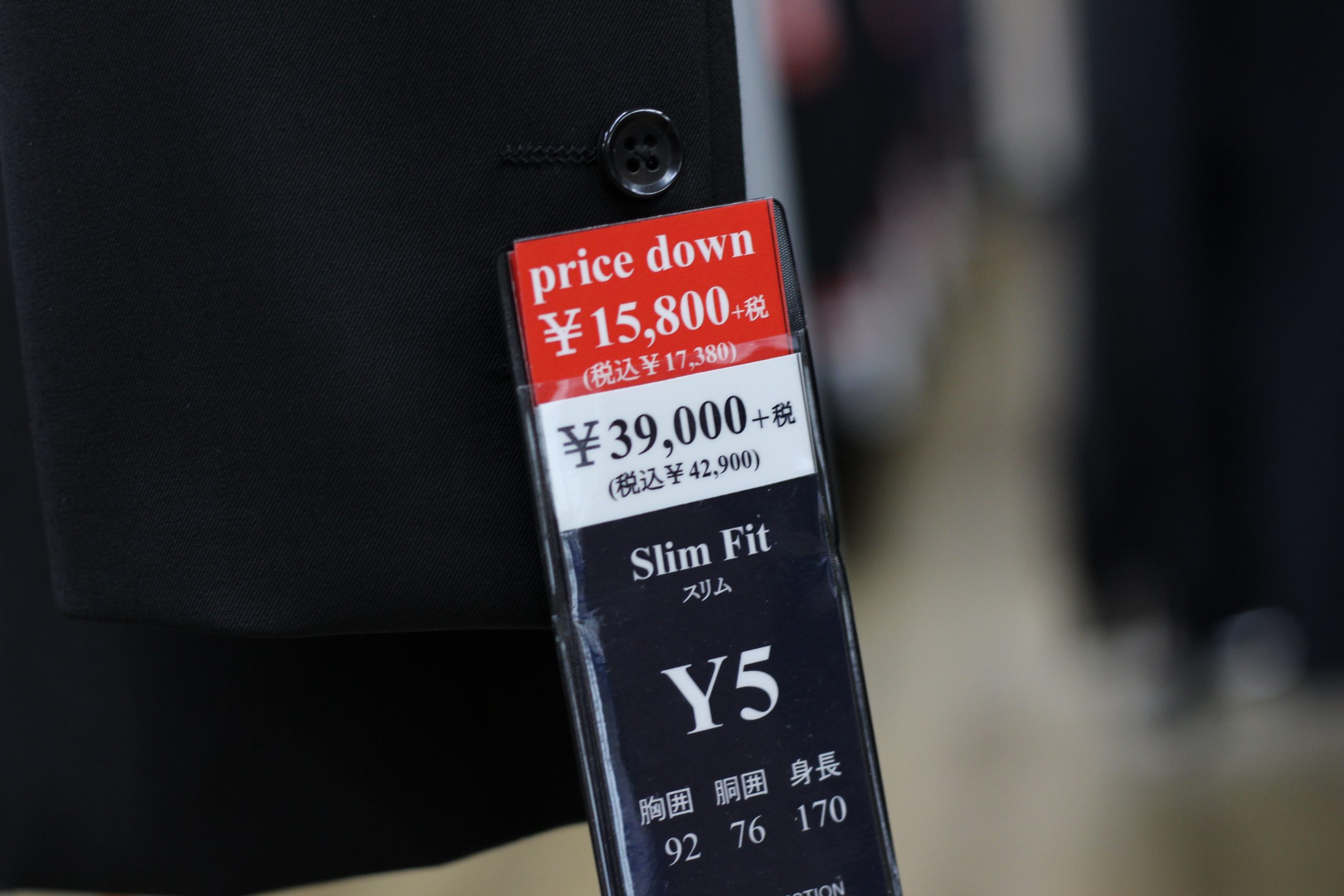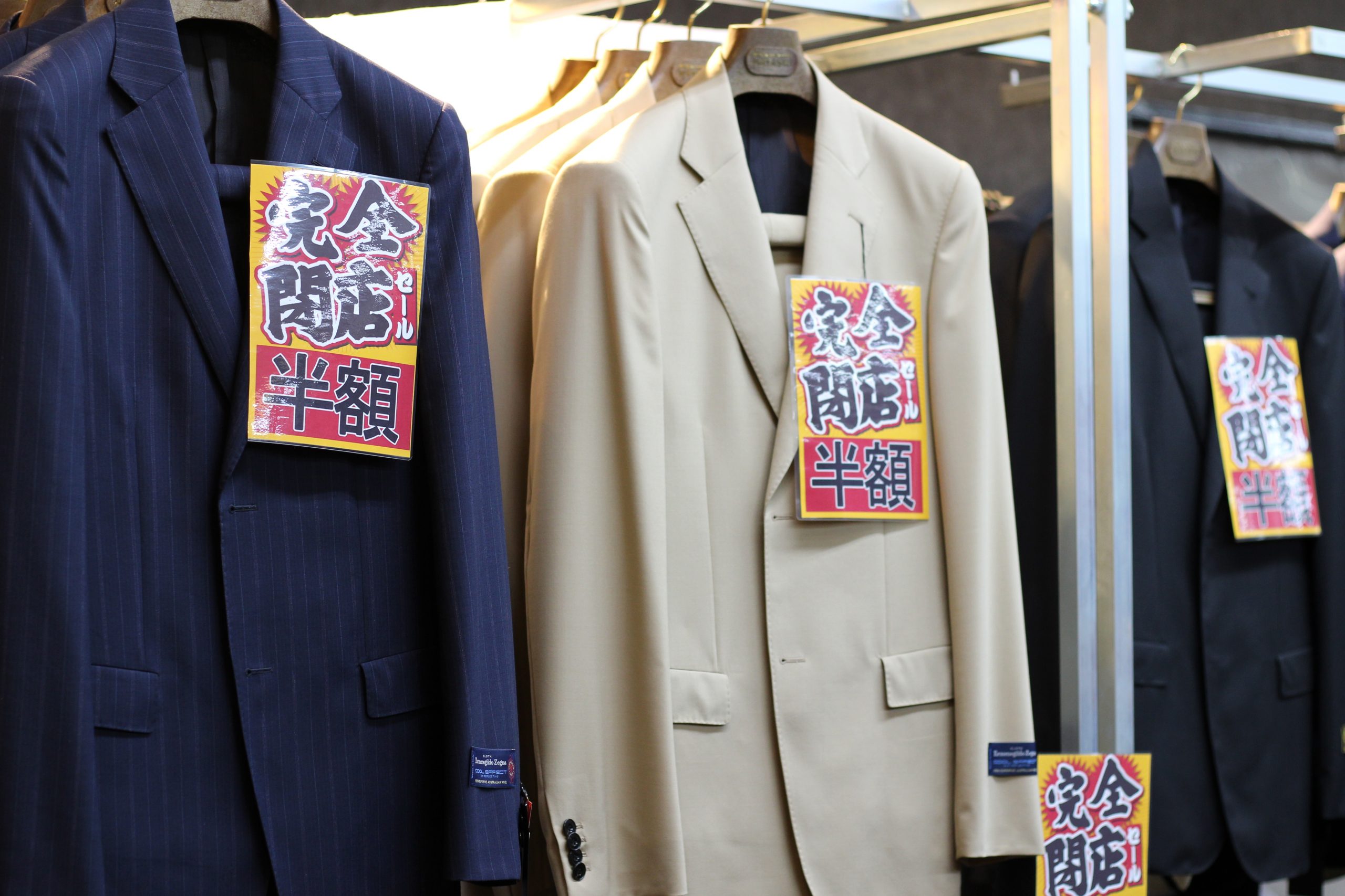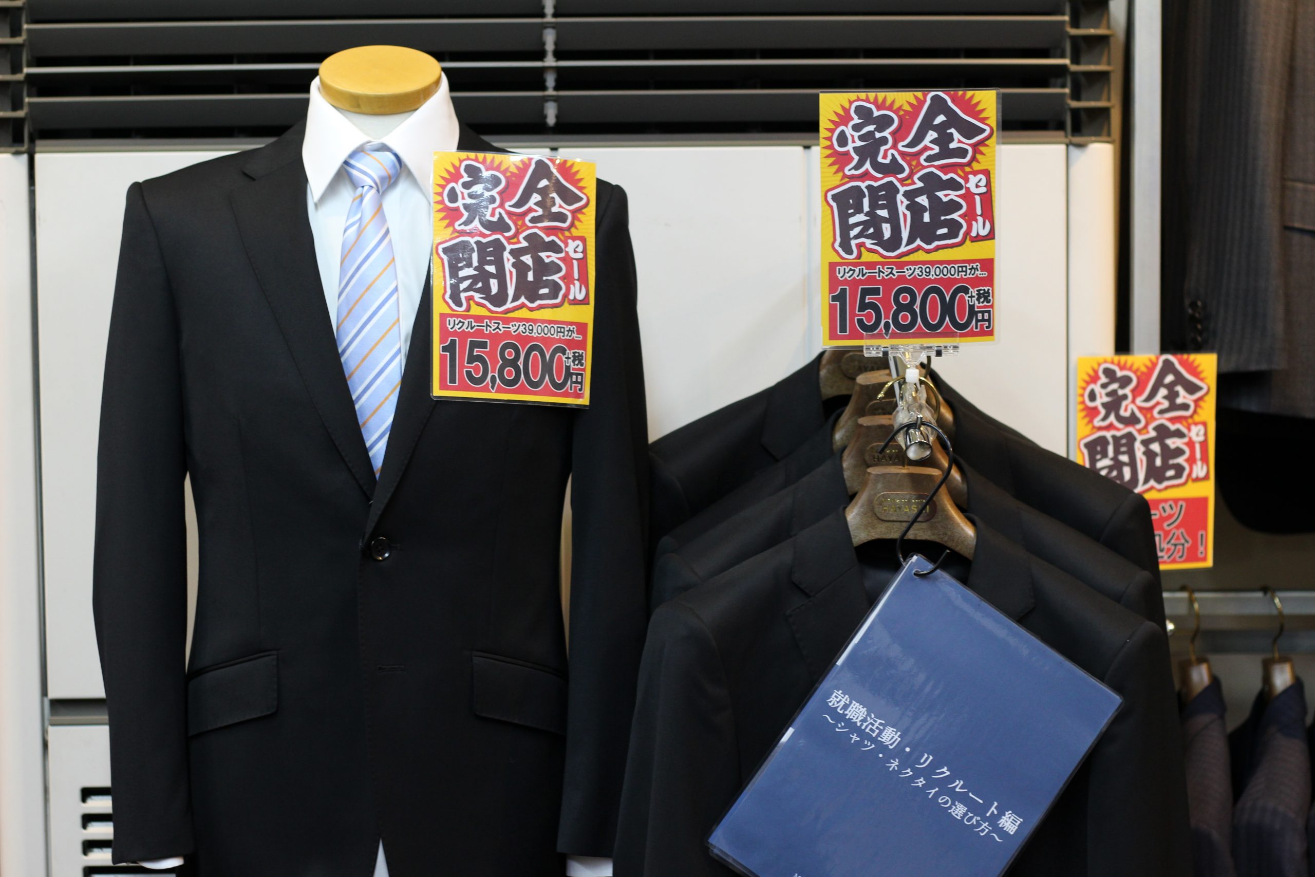 さらにさらに、就活用のリクルートスーツも今回は完全閉店セール価格にてご提供いたします!大学生の皆様もしくはご家族で就活をひかえている方々、リクルートスーツを買うならぜひこの機会に1~2着とご用意されてください!お値段は39,000円⇒15,800円+税へと値下げいたします。