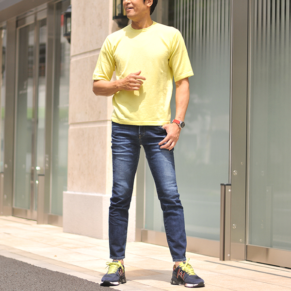 今回はイエローのトップスには、シューズのイエローと合わせ、時計の赤バンドもスニーカーのロゴを合わせるという粋な着こなし。