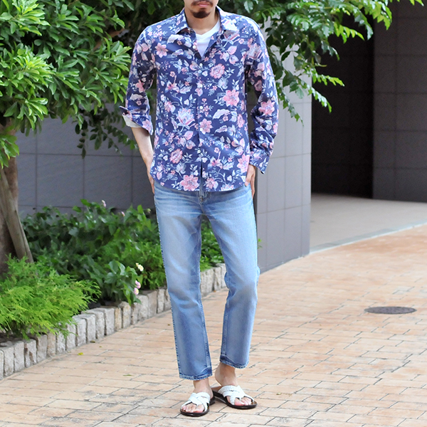 明るめのストレートデニムはクロップド丈で、花柄シャツで遊びを入れる事で、こなれ感を演出します。