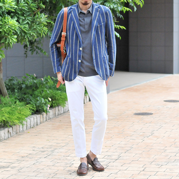 ここはテーパードの効いたホワイトパンツで爽やかさを演出してください♪