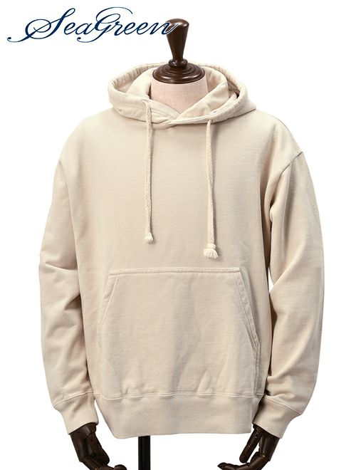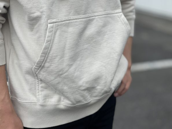 前身頃にポケットと、やや深めに仕立てられたフーディ。