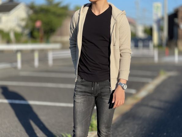 勿論、カジュアルなパーカーなんかともよく合います。ベージュ×ブラックでこなれた大人のカジュアル感グッと高まります!