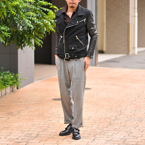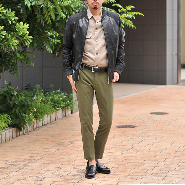 秋冬の開襟シャツを使用し、ボトムスはテーパードの効いた細身をチョイスしました。