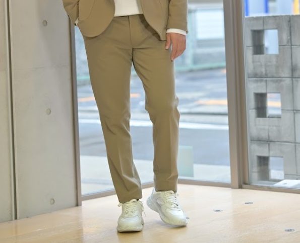 裾に向かって細くなるテーパードシルエットになっております。ノープリーツであり細目のシルエットではありますが、ジャージ生地によって窮屈さは無く快適な履き心地になります。