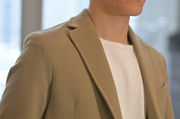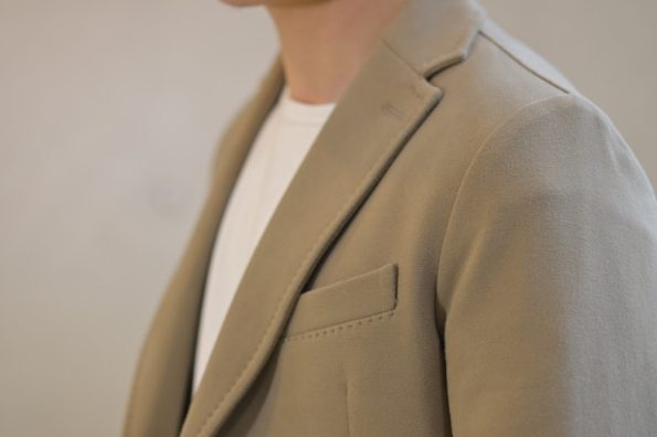 今作のジャケットは、上衿と下衿をつなぐ縫い目であるゴージラインが高めに設定されており深めのVゾーン、8㎝の太めのラペル幅でクラシックな印象。また、胸ポケットやボタンの細部までこだわった上品な仕立てとなっております。