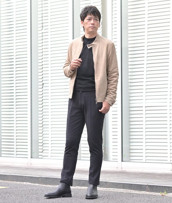 こちらは2つのコーディネートは同じブラックのパンツを使用した組み合わせとなっており、上にジャケットを合わしキレイ目なジャケパンスタイルに着こなすのも良し、ブルゾンを合わせてカジュアルスタイルとしても良しと、非常に使い勝手が良くこの秋冬でヘビロテ間違いなしの逸品です!