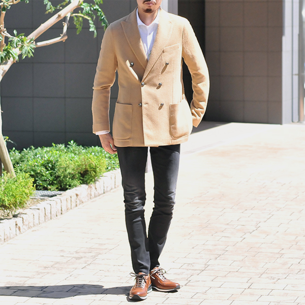 クラシカルでモダンな雰囲気が強い、ダブルのカシミヤジャケットをカジュアルダウンしてイタリアっぽく着こなすポイントのご紹介です。