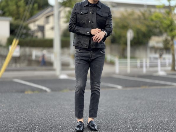 ブラックウォッシュにも、レザーは抜群に合います。写真のようなレザーを羽織っても、ブラックウォッシュなら程よくこなれ感も演出できますね!
