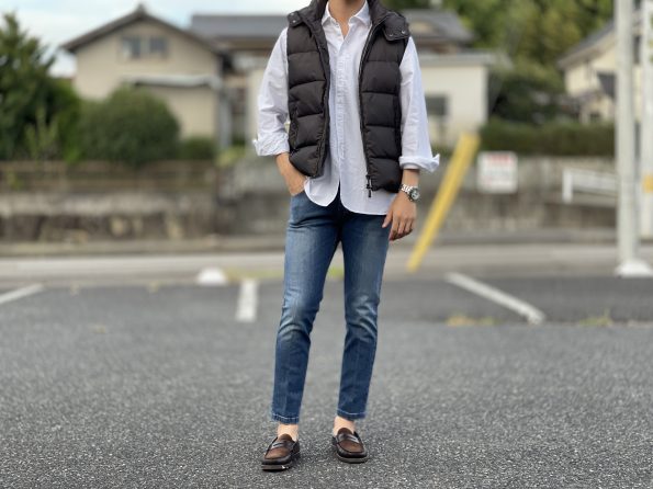 秋らしいスタイリングで組んでみました。加工感のあるデニム二白シャツ、アウターにはダウンベストを使ったスタイリング。