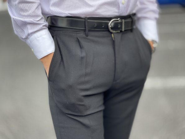腰回りにはプリーツを施すことで、ヒップや太腿周りには程よいゆとりを持たせてます。腿からは徐々に 絞りこむことで、キレイな細身のラインを作り出しています。