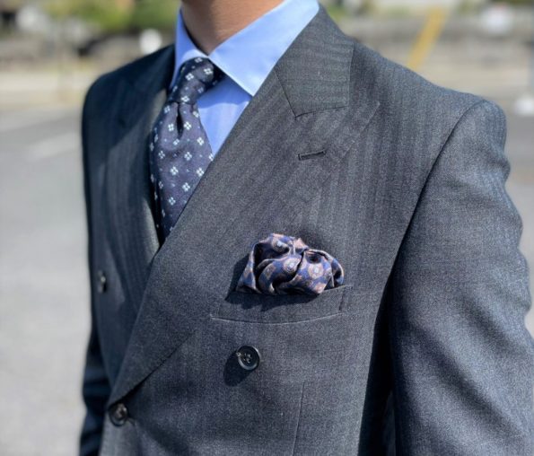 写真のように落ち着いたグレーのダブルなら、マナー上はお仕事でも問題なく着用できますが、中々日本では浸透していないのが現状ですね。。。