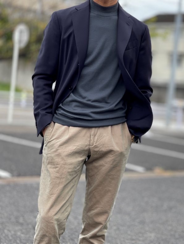 カジュアルなシャツからジャケットまで、幅広く愛用出来るモックネックニット。