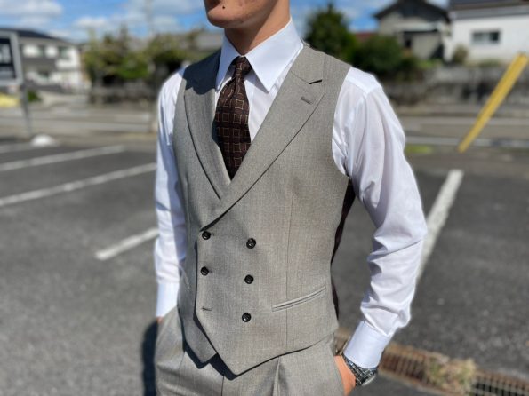 今回は共生地で別売りのベストも仕立ててます。ベストはノッチドラペル付きのダブル仕様とクラシックで、重厚感あふれるデティールにしてます。