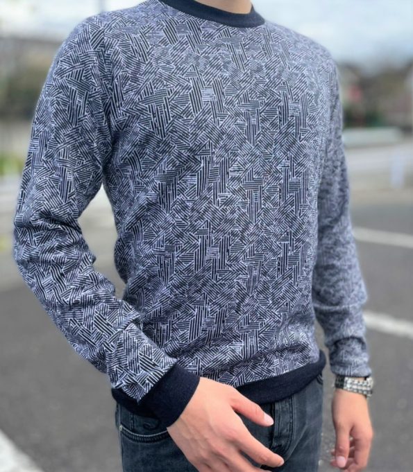 ご覧のように、幾何学模様で編み込まれたクルーネックニットです。。。